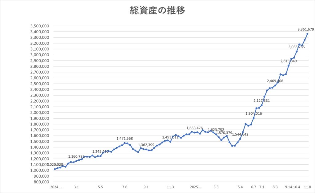 2025年11月08日時点での総資産は、3,361,679円(先週比+101,219円)となりました。