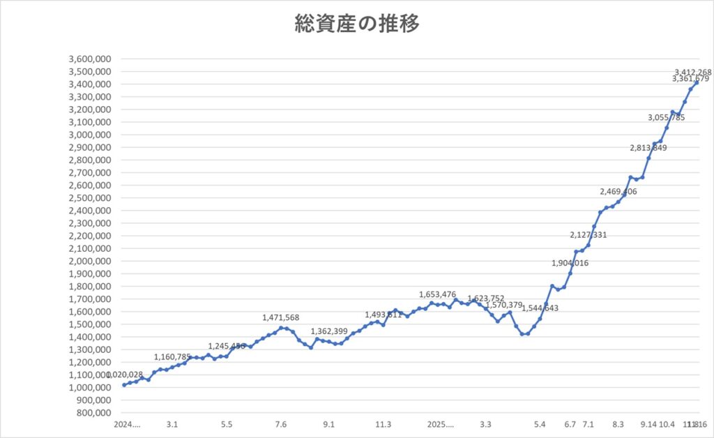 2025年11月16日時点での総資産は、3,412,268円(先週比+50,589円)となりました。