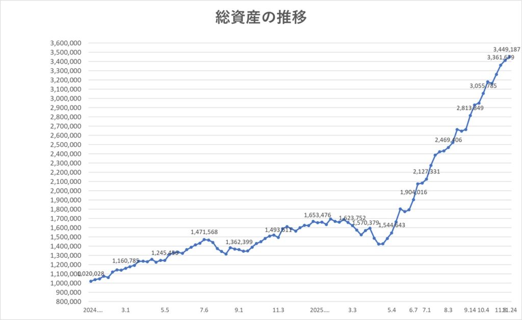 2025年11月24日時点での総資産は、3,449,187円(先週比+36,919円)となりました。
