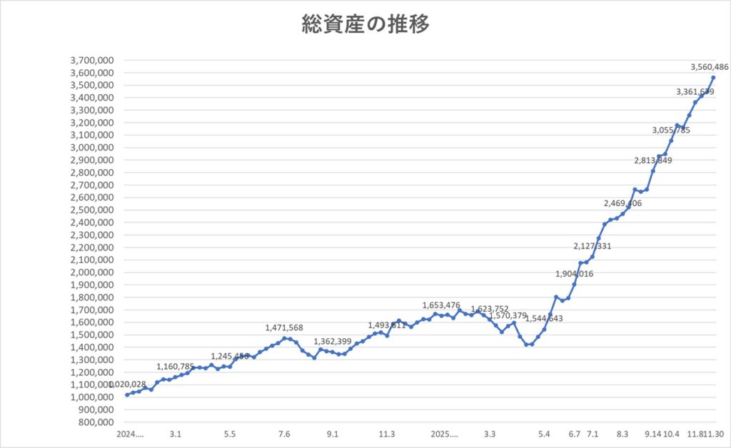 2025年11月30日時点での総資産は、3,560,486円(先週比+111,299円)となりました。