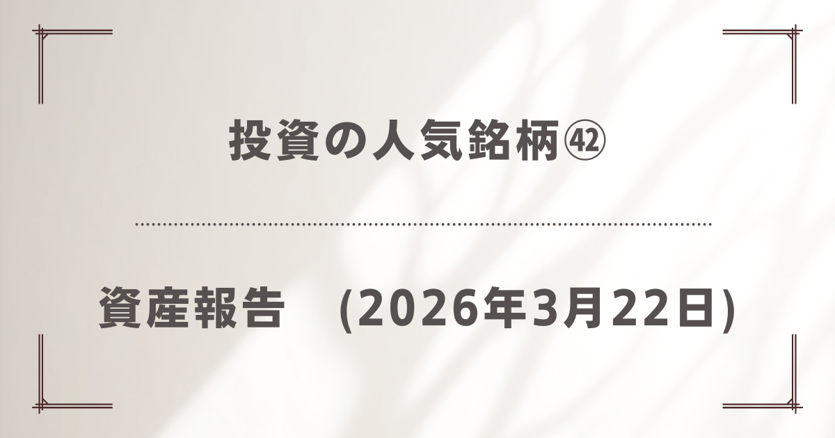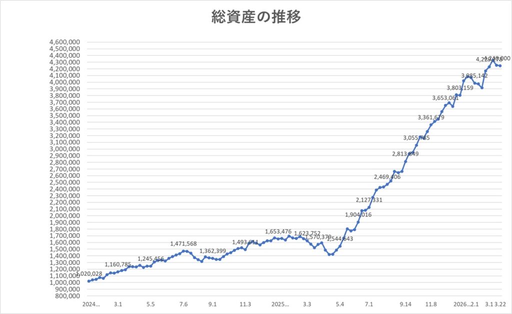2026年3月29日時点での総資産は、4,144,958円(先週比-103,042円)となりました。