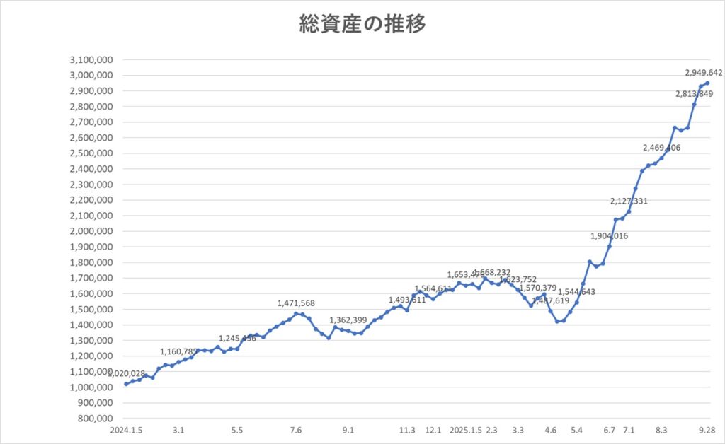 2025年9月28日時点での総資産は、2,949,642円(先週比+19,719円)となりました。