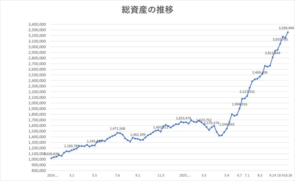 2025年10月26日時点での総資産は、3,260,460円(先週比+98,095円)となりました。