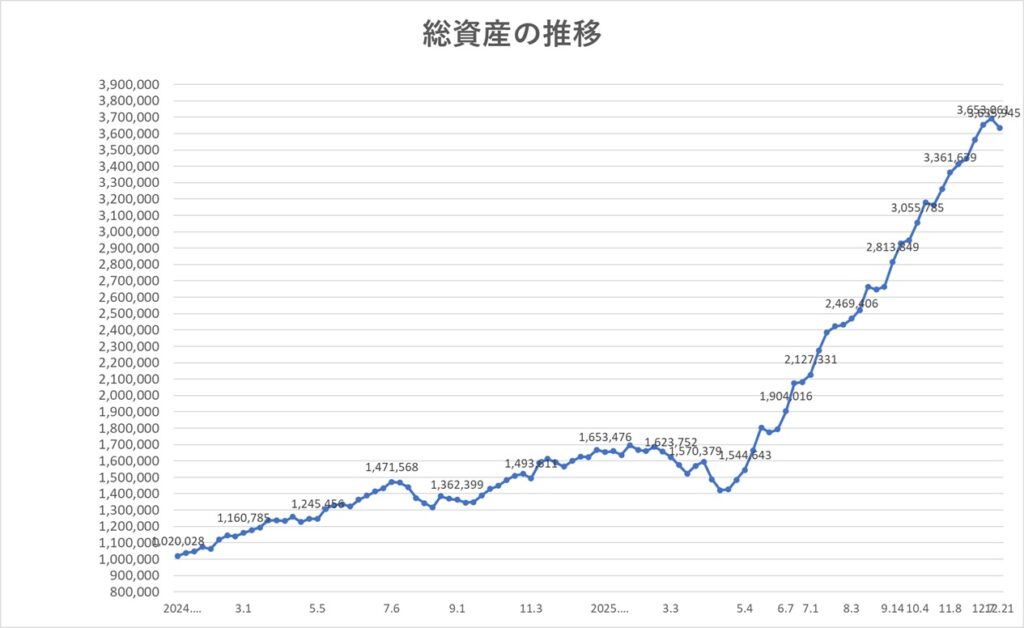 2025年12月21日時点での総資産は、3,635,945円(先週比-56,311円)となりました。
