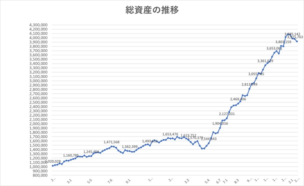 2026年2月15日時点での総資産は、3,915,763円(先週比-57,644円)となりました。