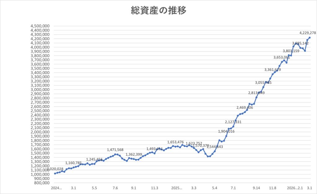 2026年3月1日時点での総資産は、4,229,278円(先週比+58,724円)となりました。